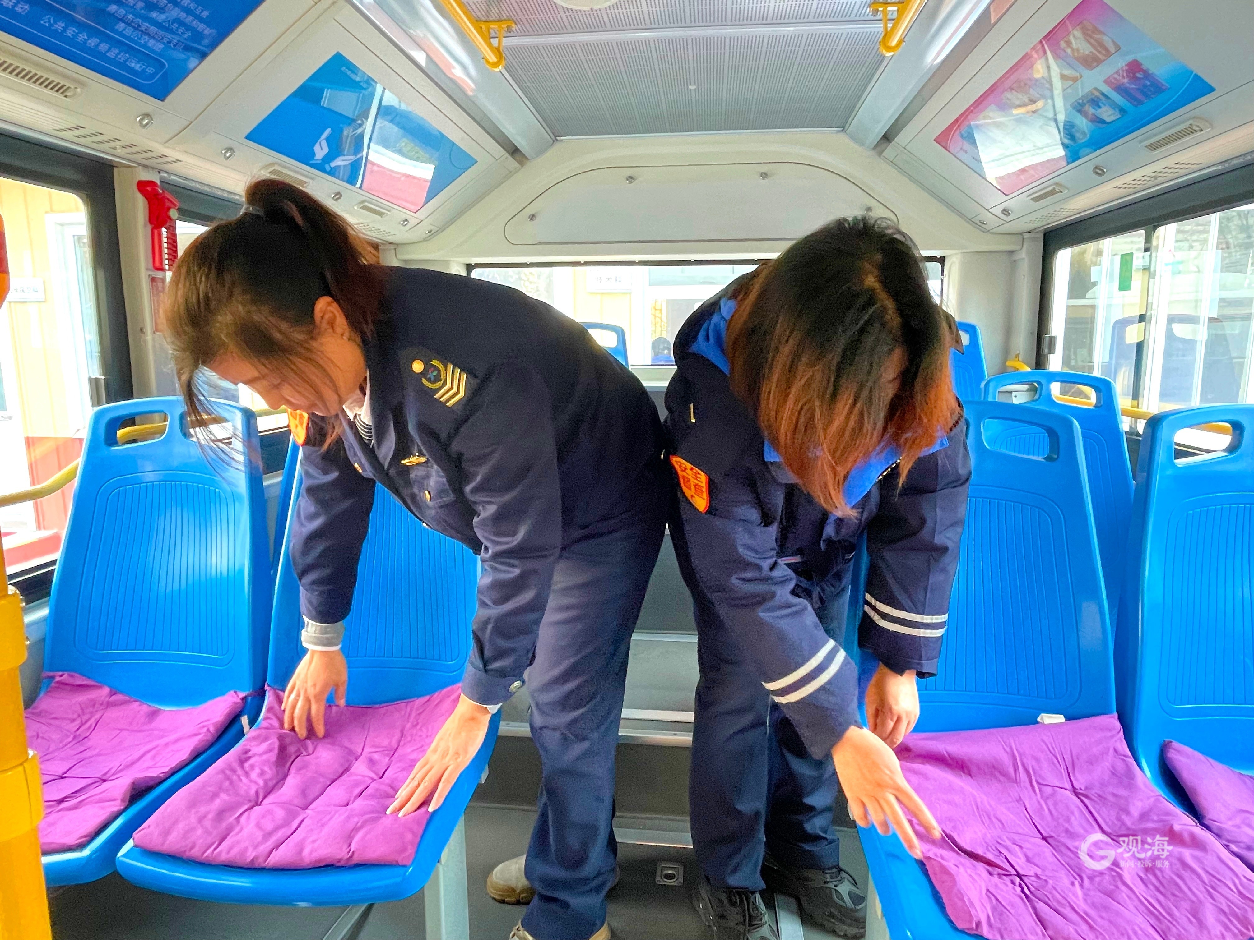 “入冬后,为车厢座椅加装坐垫是我们每年开启的‘暖冬行动’之一,正式安装前,我们会提前对这些棉垫进行清理洗涤、晾晒和消毒,并会定期更新……”在市南巴士三分公司场站,402路班组长赵娣和组员们正在车厢内紧张忙碌着,只见她们娴熟地将一张张棉垫铺置于座椅上,并逐一做固定,确保乘客温暖出行。