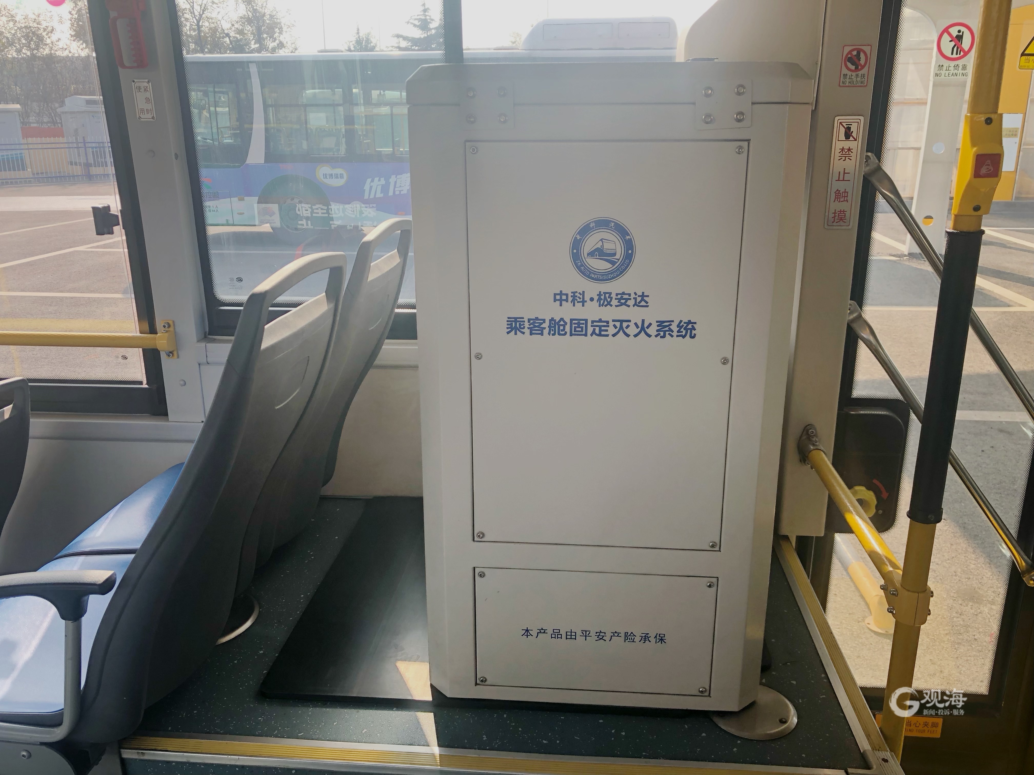 在390路公交车里,记者看出车厢后门处,除了车载灭火器外,还放置了乘客舱固定灭火系统。据介绍,该灭火系统内部装配了触感装置和车内喷淋,若发生险情,装置将自动启动,即时对车厢进行喷水灭火。新车型科技力量的注入,将更好保障乘客的乘车安全。